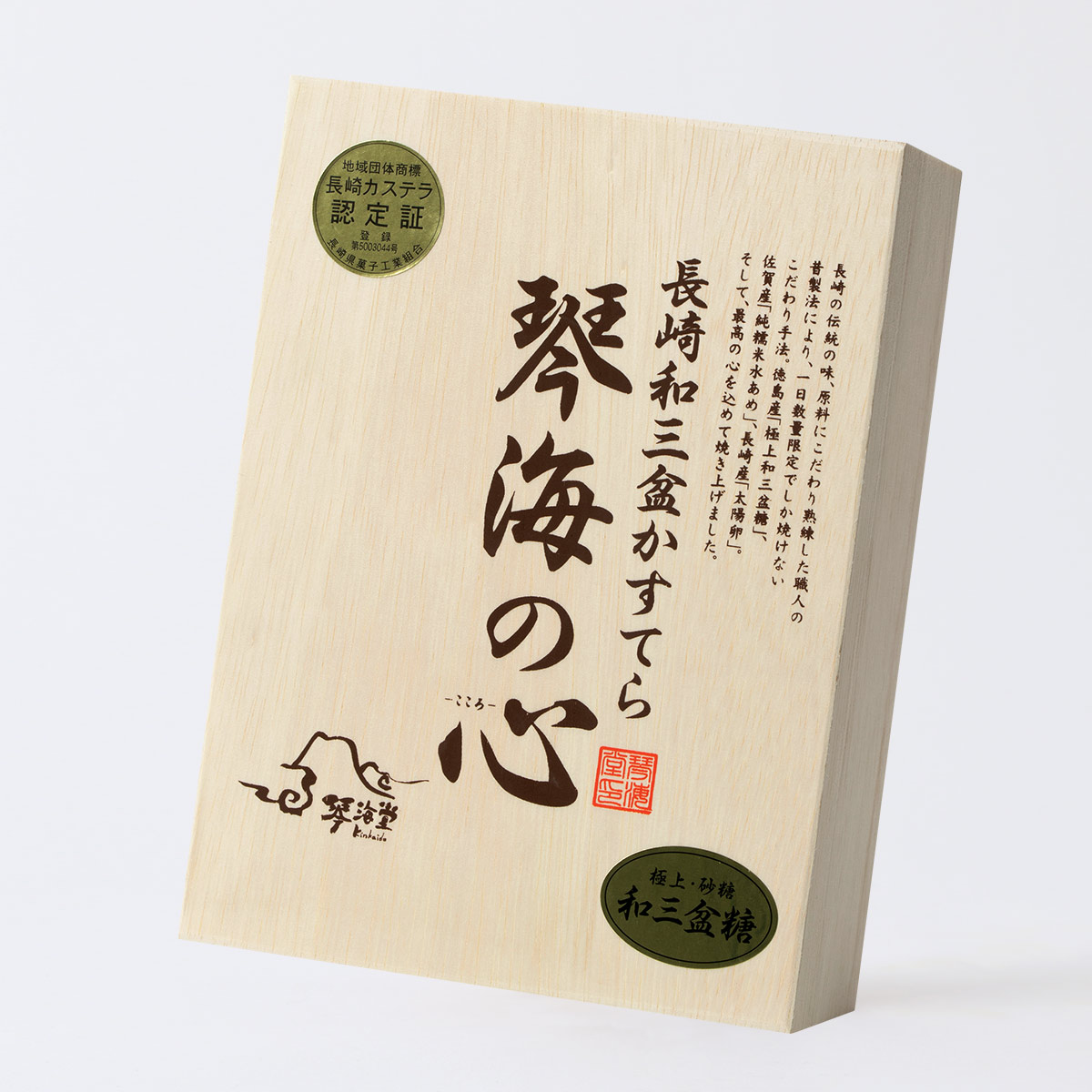 なかでも、この「琴海の心(こころ)」は、国内上質砂糖の「極上和三盆糖」、佐賀県産「純糯米水飴」、長崎県産の「太陽卵」と材料にこだわった高級品。底には大粒のざらめ糖が敷き詰められ、その食感がしっとりきめ細かな生地を際立たせています。長崎でも最上級を感じるカステラを、ぜひご賞味ください。