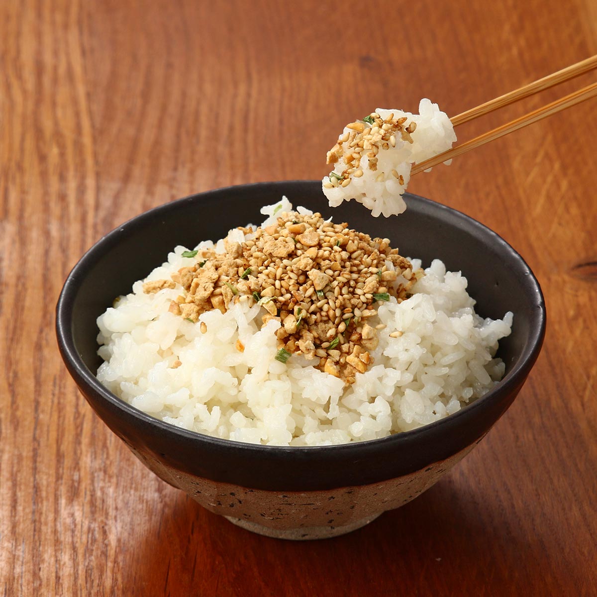 納豆にねぎや鶏肉そぼろを加え、少しピリ辛に味付けしたスタミナ納豆を手軽に味わえるようにふりかけで再現しました。
