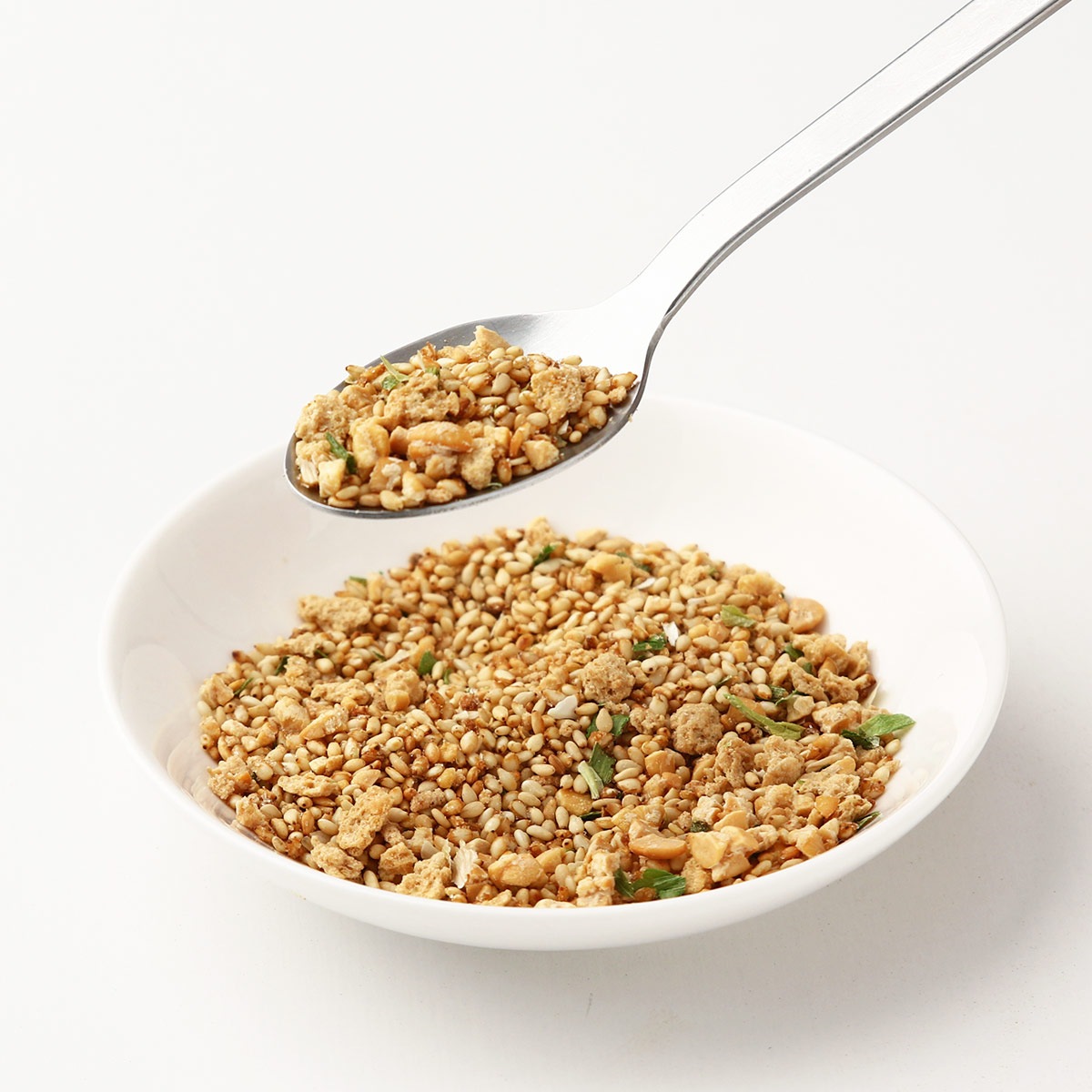 ふりかけベース(いりごま、味付ごま、鶏肉そぼろ、食塩、乾燥ねぎ、フライドガーリック、ぶどう糖、砂糖、でん粉、鰹節粉末、鰹削り節粉末、唐辛子、鯖節粉末、酵母エキス、煮干エキス粉末、生姜粉末)(国内製造)、乾燥納豆/調味料(アミノ酸等)、セルロース、甘味料(ステビア)、加工でん粉、乳化剤、カラメル色素、酸化防止剤(ローズマリー抽出物)、香辛料抽出物、(一部に小麦・卵・乳成分・ごま・さば・大豆・鶏肉を含む)