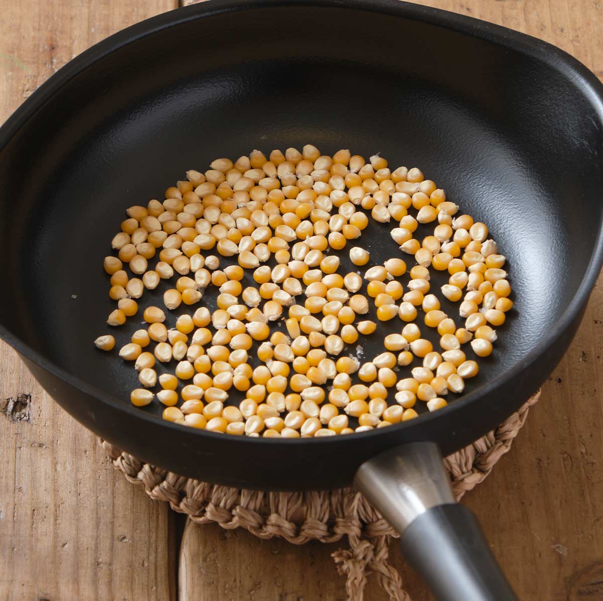 3.豆がはじける音が止まるまで、時々フライパンを揺らしながら加熱する。