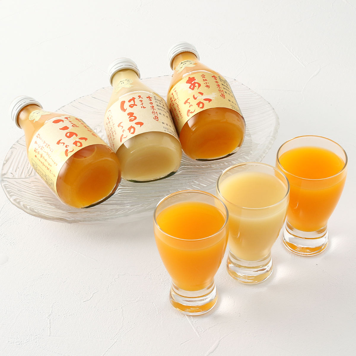 太陽の陽とミネラルたっぷりの潮風を浴びた温州みかん愛紅小町あいかちゃん・はるか・でこ姫をぎゅっと絞った100%果汁です。