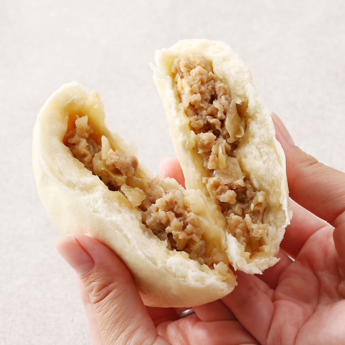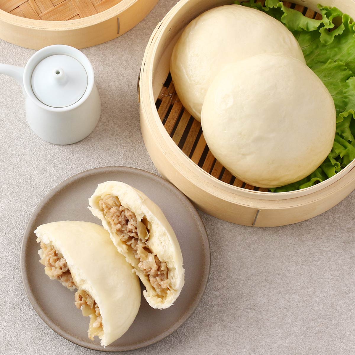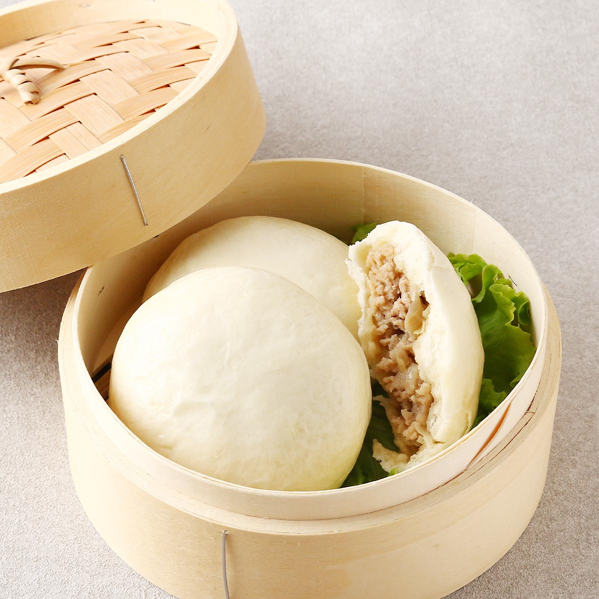 豚まんを袋から出し、流水で2秒間しっかりとぬらし、ラップでふんわり包みこみ、そのまま電子レンジで500W3分を目安に温めてお召し上がりください。